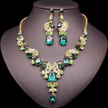 ファッションインドのブライダル ネックレス&ピアスセット ドバイ高級クリスタルウェディングジュエリーセット ゴールド色の女性の衣装ジュエリーギフト ピーコックグリーン【c0011】