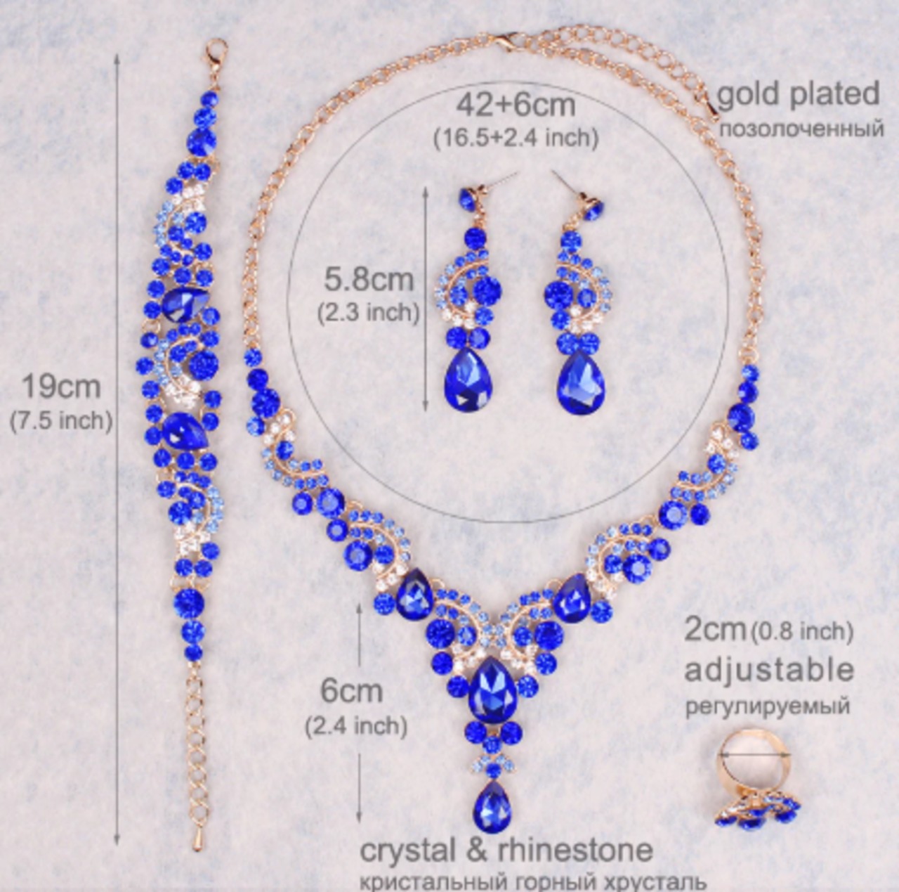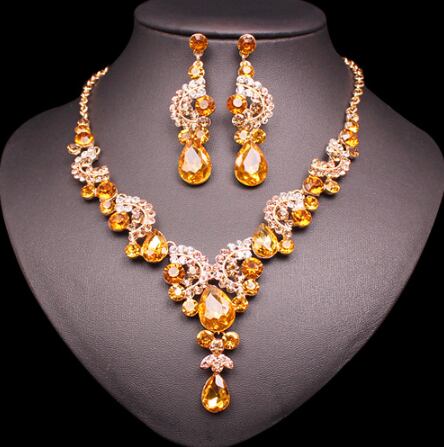 ファッションインドのブライダル ネックレス&ピアスセット ドバイ高級クリスタルウェディングジュエリーセット ゴールド色の女性の衣装ジュエリーギフト トパーズ【c0012】