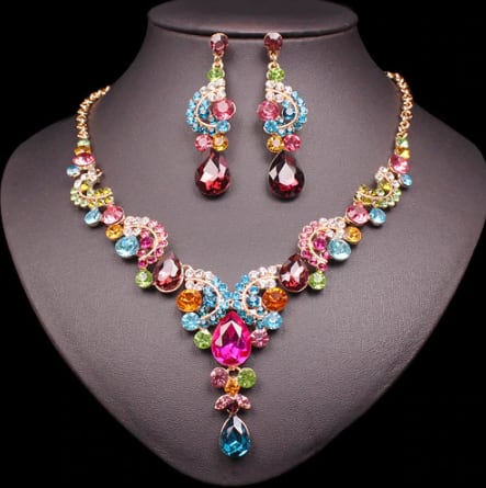 ファッションインドのブライダル ネックレス&ピアスセット ドバイ高級クリスタルウェディングジュエリーセット ゴールド色の女性の衣装ジュエリーギフト レインボー【c0013】